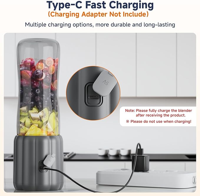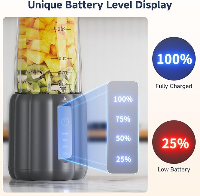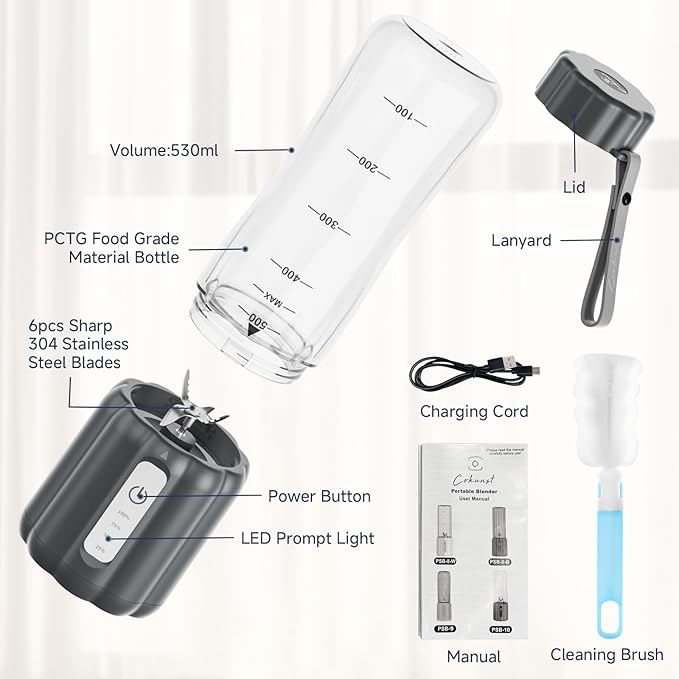 - Powerful & Rechargeable: Equipped with six stainless steel blades and capable of speeds up to 22,000 rpm, it easily pulsates soft fruits and vegetables, extracting nutrients while maintaining a smooth texture. Its generous 17Oz capacity and included USB charging cable ensure long battery life and smoother blends. Note: Juicing requires water or milk