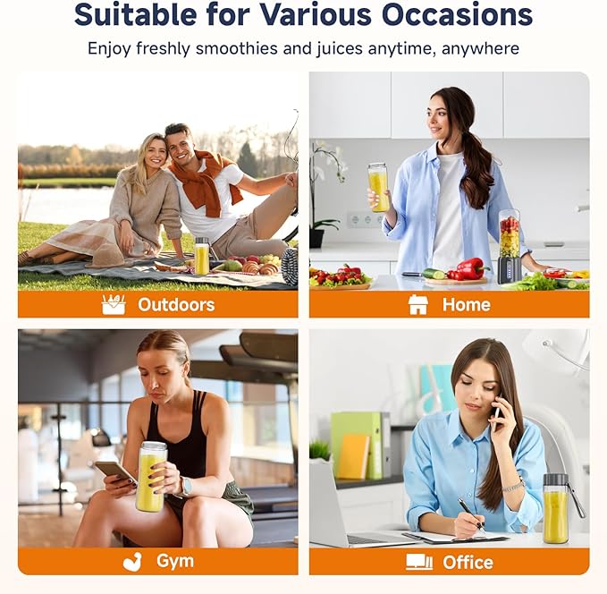 - Portable & Widely Application: The portable blender is perfect for making nutritious single-serving smoothies, juice blends, mixed fruits and vegetables, coffee, milk powder, protein shakes, baby food, it is suitable for the kitchen, office, outdoors, travel or sports. Extra handle and lid for easy portability after mixing