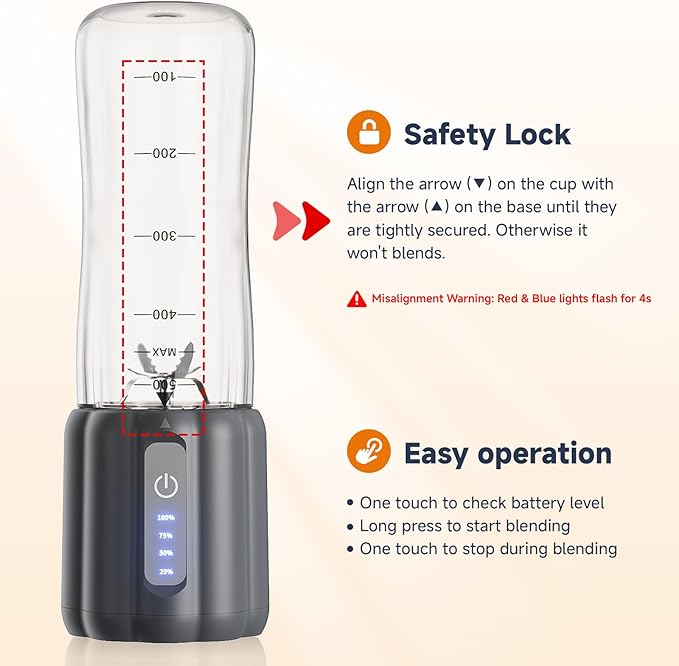 - Unique Safety Lock System: This portable blender is equipped with an enhanced safety lock mechanism to ensure safe operation. The mini blender will only work properly when the bottle and base are correctly locked in place - simply align the transparent "↓" mark on the bottle with the "△" indicator on the base for a perfect fit - see the instructions for details