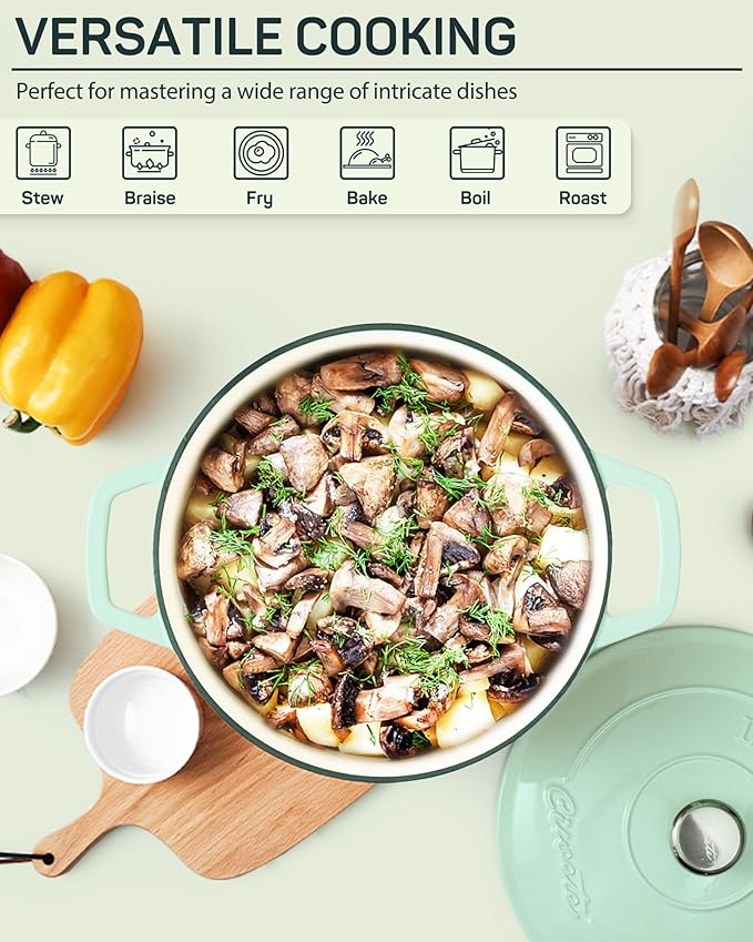 - Stylish & Functional Design: Combining practical functionality with elegant design, the cast iron dutch oven is a beautiful addition to any kitchen. Available in various colors and featuring an elegant shape, it enhances your cooking experience and adds a stylish touch to your kitchen decor
