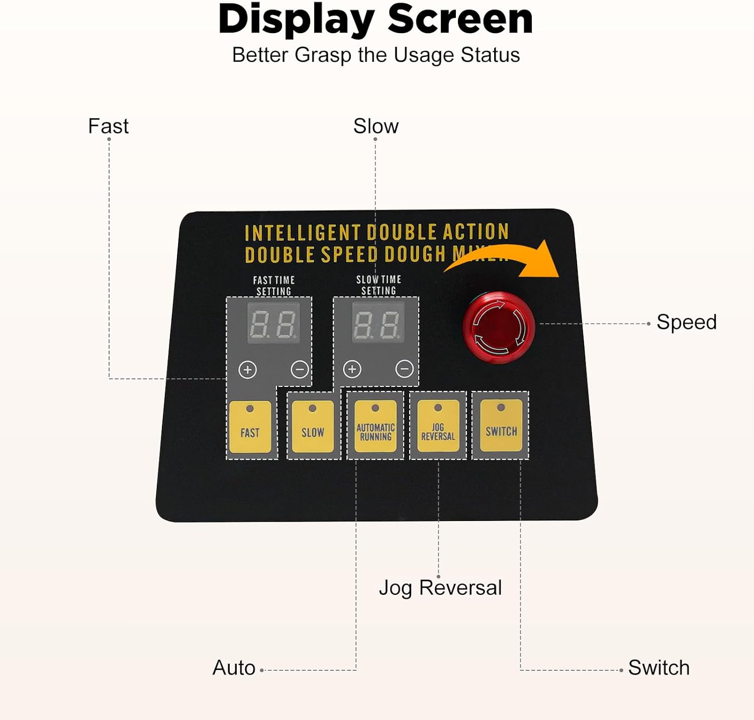 - 【High Efficiency】---The copper core motor with high power (750W ) and high speed (100/200r/min) can provide strong power. Besides, the spiral stirring rod can achieve uniform mixing and the powerful chain drive system rotates the rod and the bucket at the same time, which can increase the contact area between the flour and the rod.