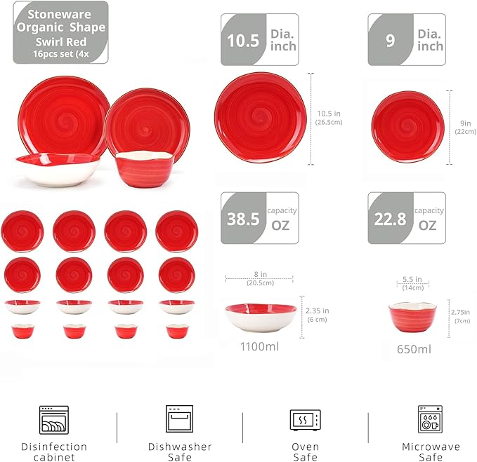 Highland 16-Piece Dinnerware Set Service for 4, Organic Shape Stoneware Plates and Bowls Set, Scratch Resistant, Microwave and Dishwasher Safe, Speckled Effect Handcrafted, Swirl Red