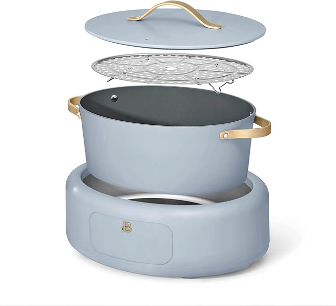 - Lightweight Cast Aluminum – Non-stick interior browns evenly yet weighs under 4 lb; stainless-steel handles stay cool and pot, lid & steam rack are all dishwasher-safe.
