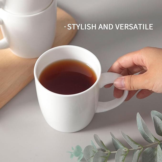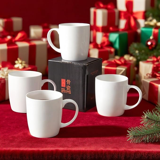 Luxury Bone China Mug Set (12 oz, Set of 4) – White Fine Porcelain Mugs for Tea, Coffee, Latte Art, Barista Use, Elegant Gifting