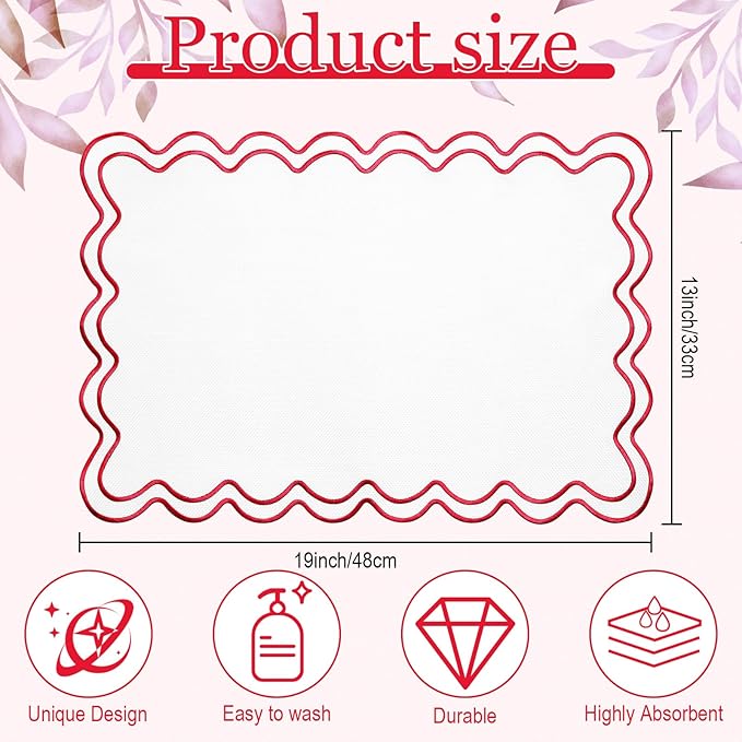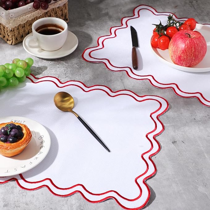 12 Set Linen Placemat 13x19 Wavy Embroidery Scalloped Placemat Double Layered Washable Farmhouse Dinner Table Mat Fabric Napkin for Christmas Hotel Restaurant Wedding Party(White&red)