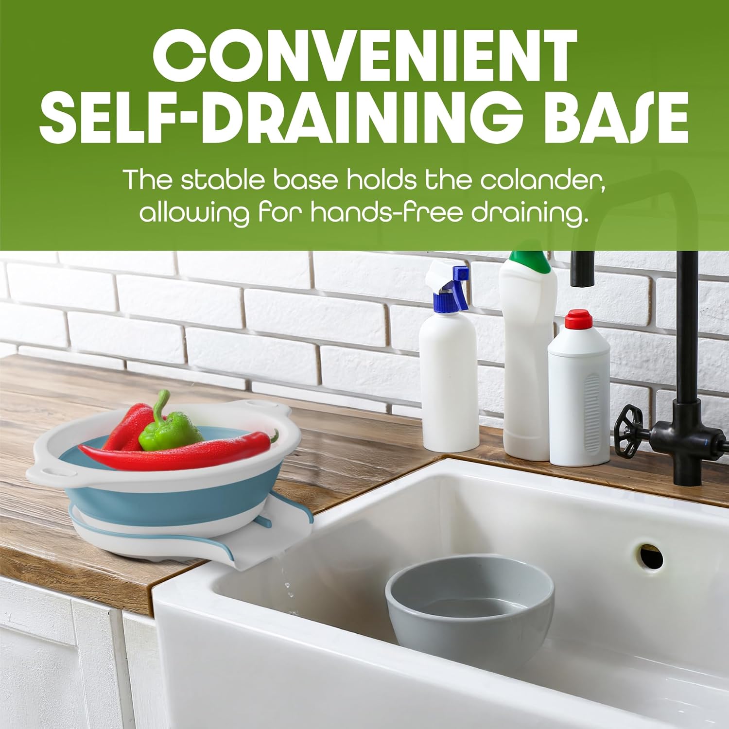 - This set of 2 collapsible colanders features an innovative self-draining base that allows water to drain directly into your sink, even when it's full.