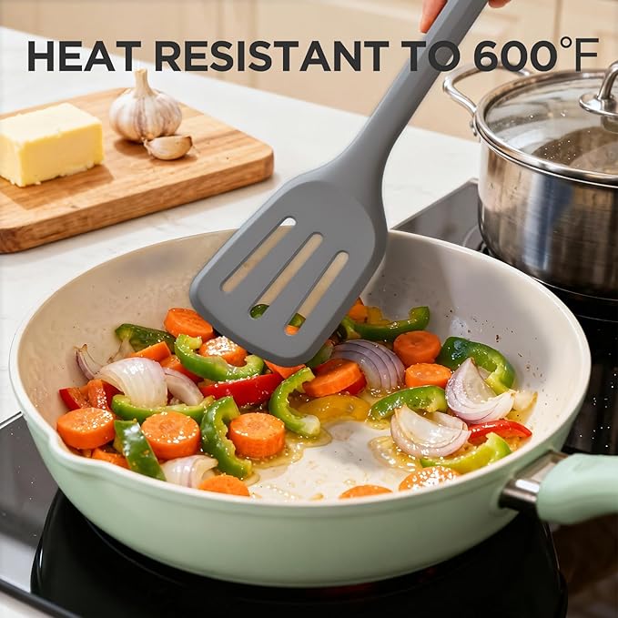 - 【Slotted Design for Healthier Meals】Designed as an all-purpose cooking utensils set, this pair includes a solid turner and a slotted silicone spatula that quickly drains excess oil and liquids for cleaner, healthier meals. The slotted design also reduces steam build-up, prevents sticking, and offers lightweight control—making this one of the most versatile silicone cooking utensils set choices among spatulas for kitchen use.