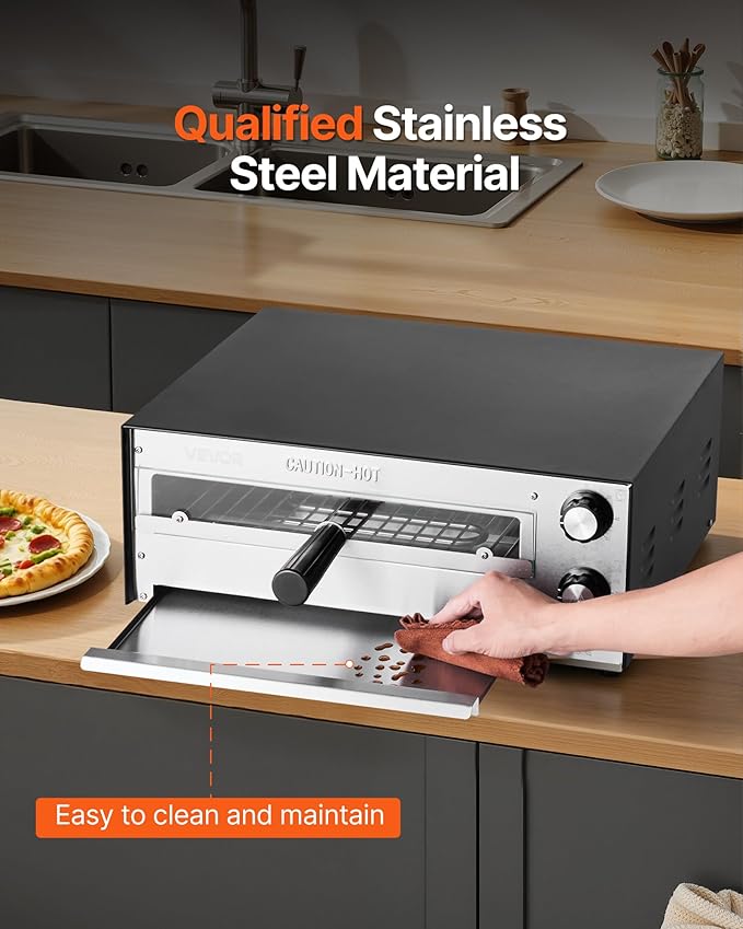 - Effortless Baking: VEVOR electric pizza oven delivers a safe and effortless baking experience. The detachable pull out crumb tray & baking grill and non-stick interior material make cleaning up a breeze, it cooks crispy 12" pizzas—ideal for kitchens, dorms, camping, and parties