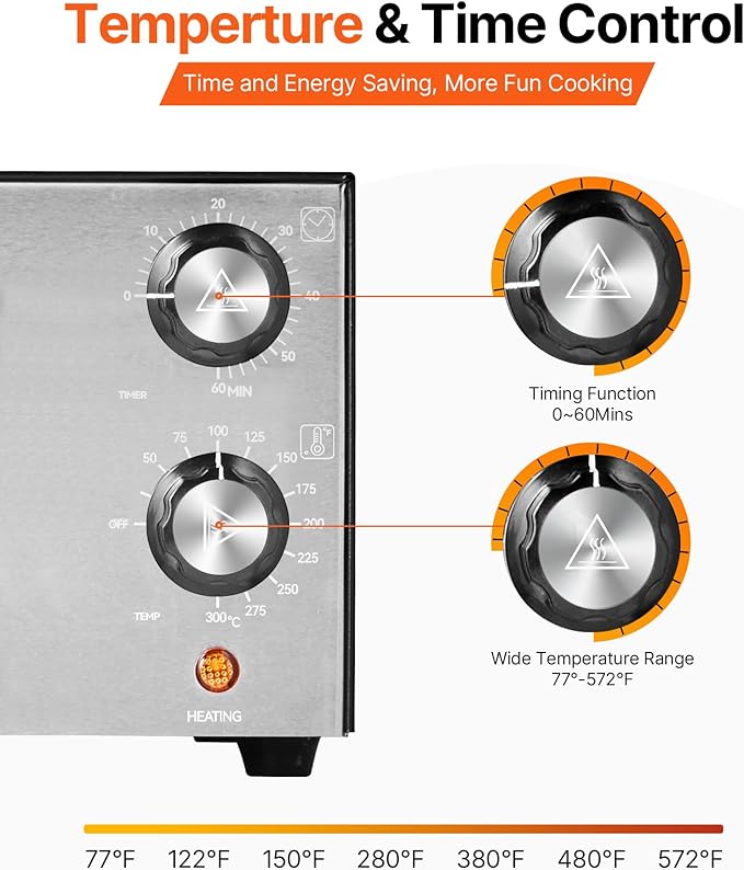 - Timer & Temperature Control: Easily adjust baking temperature from 77°F to 572°F (25–300℃) with the knob for precise cooking every time. A built-in 0–60 min timer lets you set and forget—no more overcooking or underbaking. Just dial, bake, and enjoy perfect results