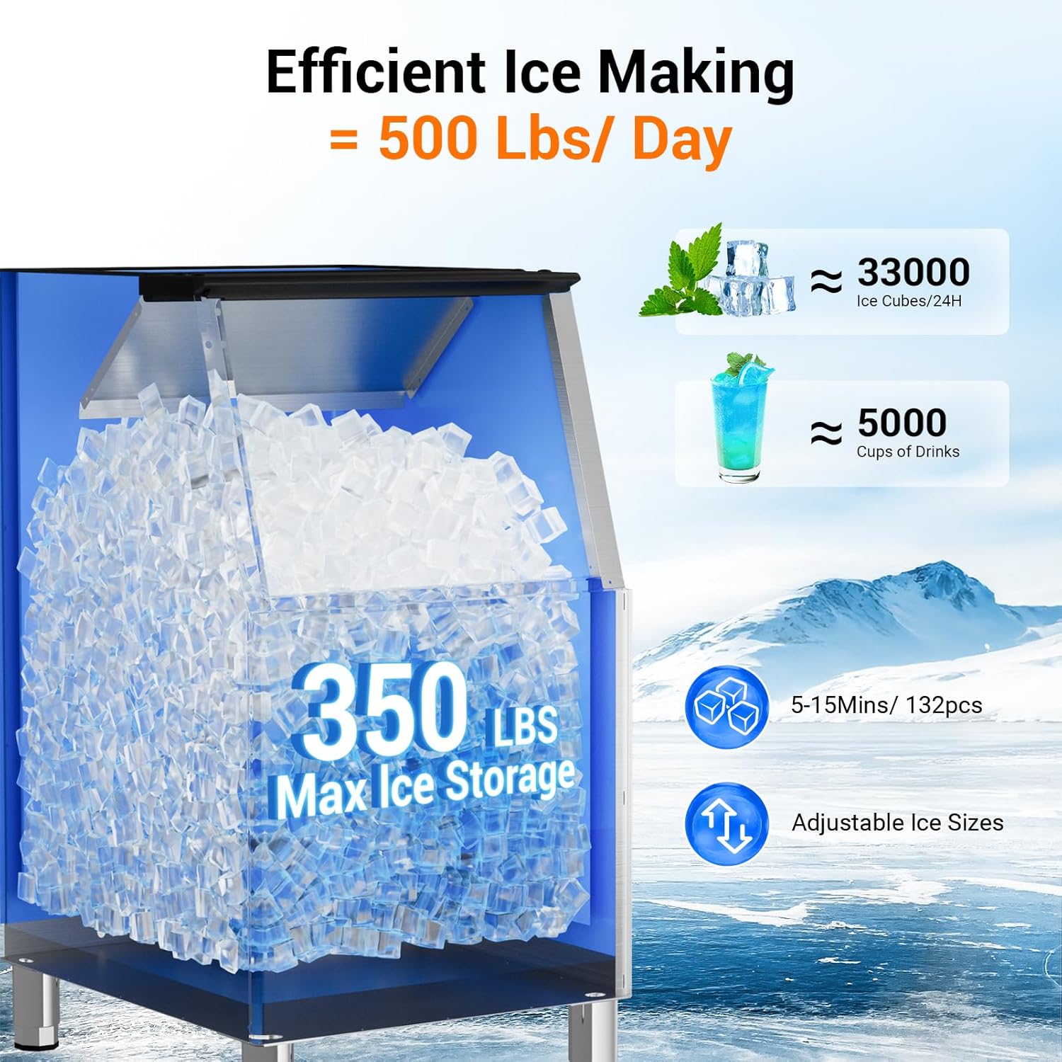 500 LBS/24H Commercial Ice Machine Maker with 350LBS Storage Bin, Large Industrial Ice Maker, Self-Cleaning, Timing Function, 132 Ice Cubes in 5-15min, 30 Adjustable Ice Thicknesses