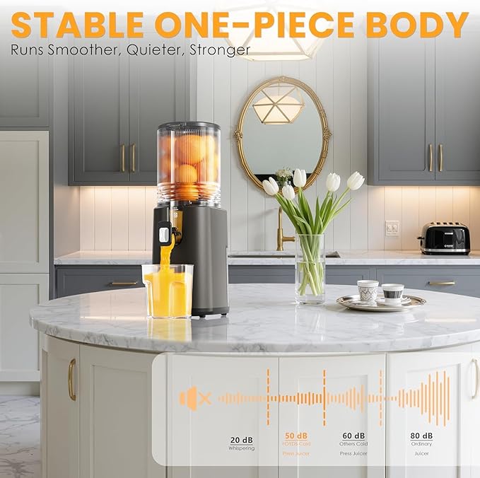 - Extra Wide 5.5-Inch Feed Chute: Featuring an ultra wide 5.5inch feed chute, this masticating juicer allows you to insert whole fruits and vegetables without pre-cutting, reducing prep time and preserving more nutrients. Ideal for busy mornings and anyone who loves fast, fresh juice without the hassle.