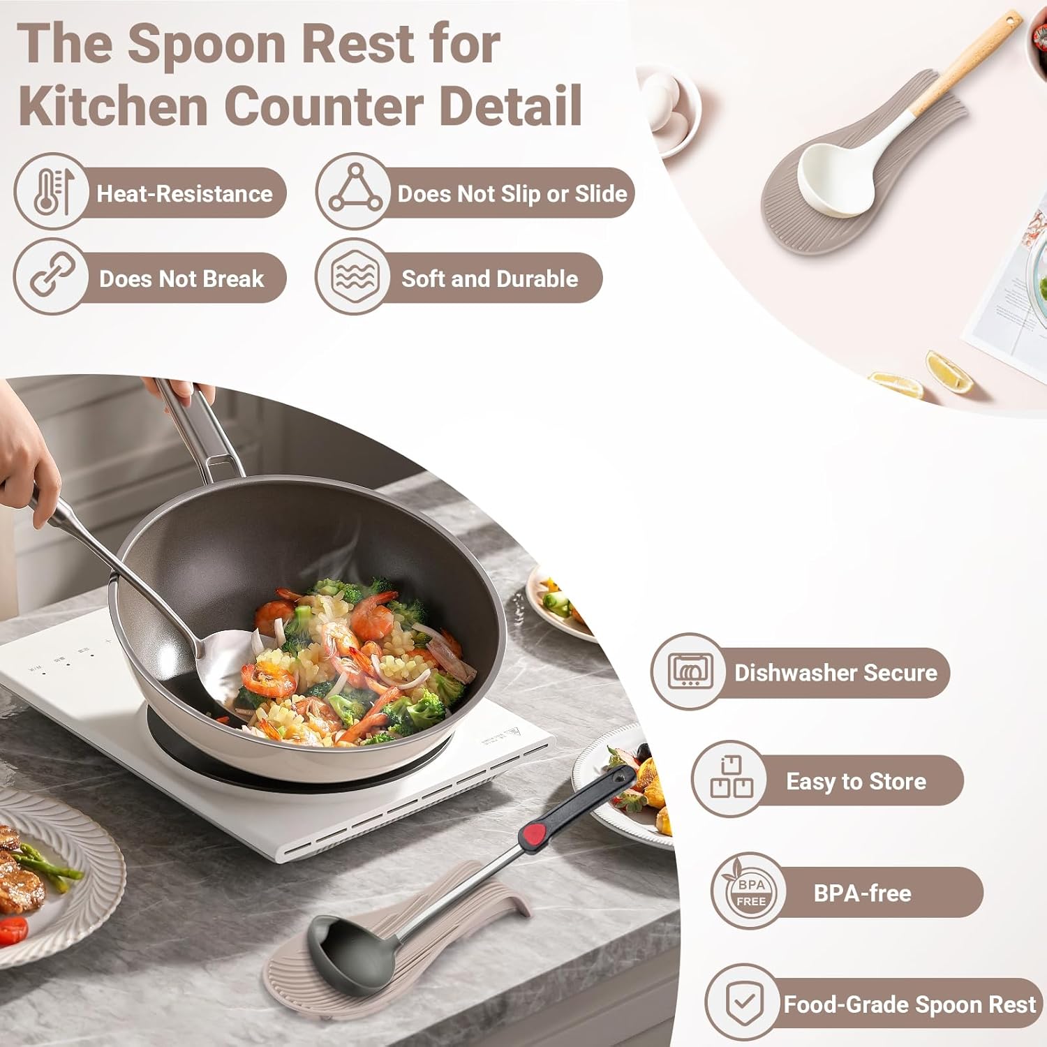 Heat Resistant Silicone Spoon Rest, Non-Slip Spoon Holder for Kitchen Counter, Silicone Spoon Rest for Stove Top for Spoons, Spatulas, Ladles, Tongs (Khaki)