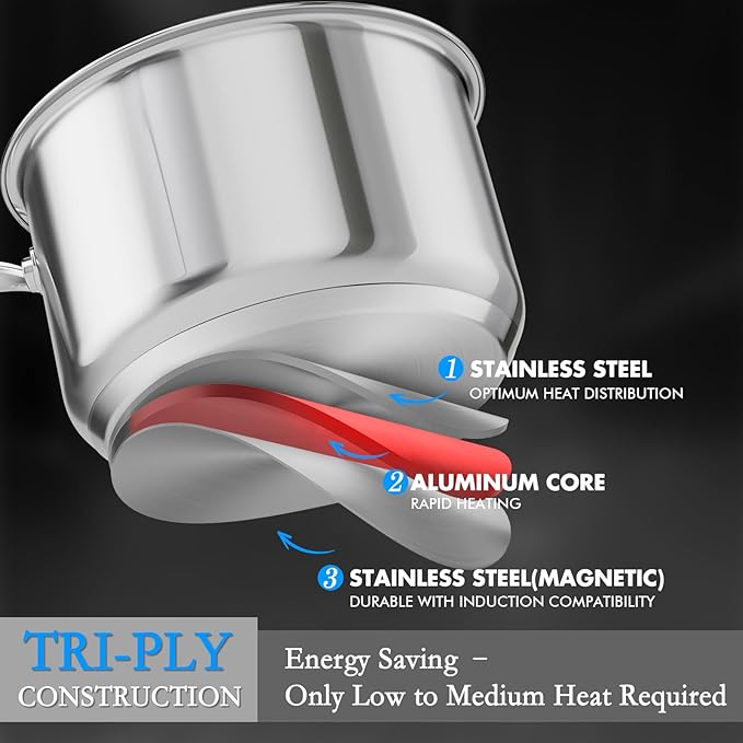 - [Premium Stainless Steel for Superior Performance]: Crafted from durable, food-grade stainless steel for lasting performance and a professional, polished look. This cooking set features an encapsulated base for rapid and even heat distribution, eliminating hot spots. The non-reactive, non-toxic surface won't alter flavors, ensuring pure and healthy meals. The multi-level steamer pot and basket allow for versatile, layered cooking.