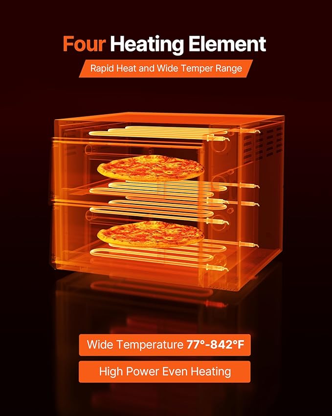 - powerful commercial pizza oven empowers you to bake crispy and yummy pizza just in a few minutes. Coupled with top and bottom dual heating tubes, it unleashes 360° uniform baking and sufficient heat to swiftly cook your food to perfection every time