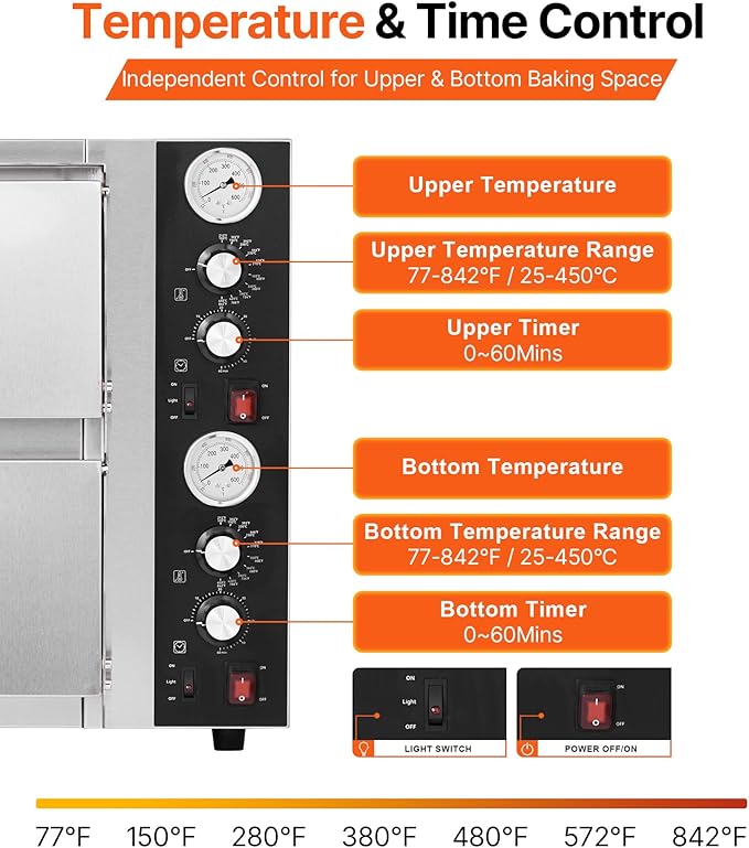 - Enjoy Crispy Pizzas Every Time: The With 1740W of power on each deck (total 3480W), this commercial pizza oven heats up fast and delivers intense, even heat—allowing you to bake mouthwatering, crispy pizzas in just minutes