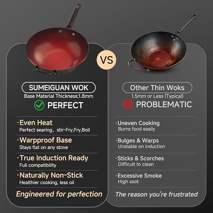 - GENUINE TASTE & ALL-IN-ONE VERSATILITY Bring authentic wok flavor to your kitchen or outdoors with SUMEIGUAN's 13.5" flat bottom carbon steel wok. Designed to lock in juices, it's ideal for everything from classic American steaks, pan-seared chicken, and sautéed vegetables to Chinese stir-fries, Japanese noodles, and Thai curries. It's your ultimate go-to for pan-frying, braising, deep-frying, searing, and steaming. Compatible with all stovetops including induction, gas, and electric, as well as BBQ grills and camping stoves.
