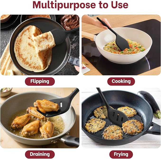 - 2 Sets & Multi-Purpose to Use: This set of solid and slotted spatulas adapts to diverse cooking tasks, like turning eggs, lifting pancakes, or draining fried foods, an indispensable cooking utensils set for the modern kitchen