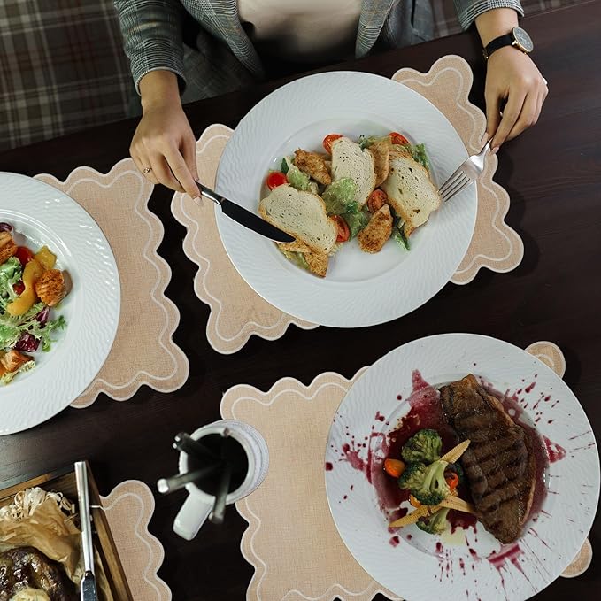 - Quality Material: crafted from linen fabric, these scalloped placemats are built to withstand daily wear and tear as well as special holiday meals; The material ensures that the wavy embroidered designs remain intact and vibrant