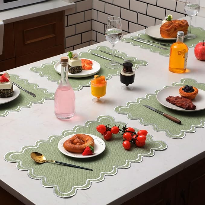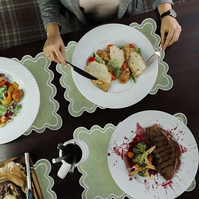 - Quality Material: crafted from linen fabric, these scalloped placemats are built to withstand daily wear and tear as well as special holiday meals; The material ensures that the wavy embroidered designs remain intact and vibrant