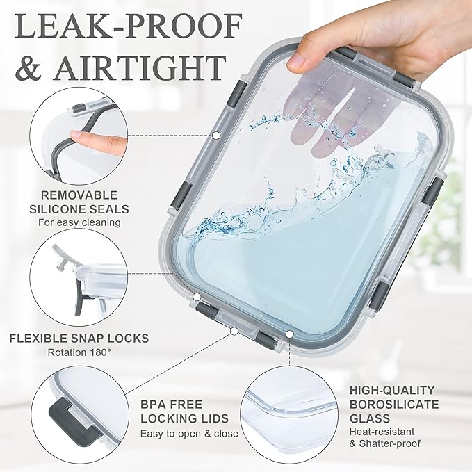 - Air-Tight & Leakproof: GEHE lunch box containers are designed with removable silicone seals and 4-hinge snap locking lids to prevent your food, sauce or soup from spilling or leaking, ensure your prep meal's temperature last longer time and maintain freshness of your food. Compared to other glass food containers, it's also very convenient for you to open and close the lids instead of worrying about lids breakage after long-term use.