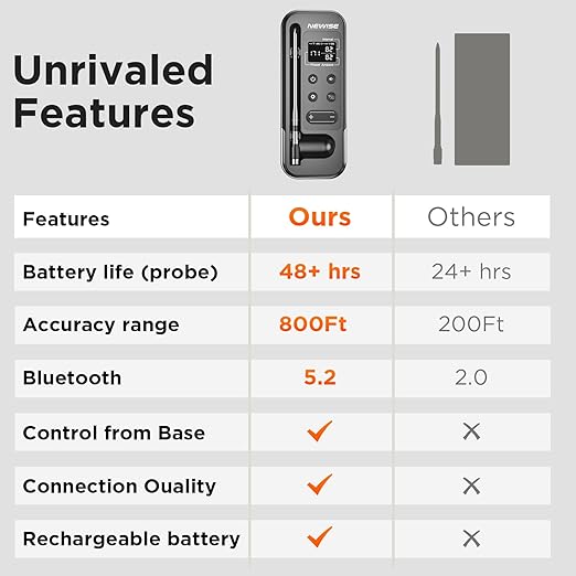 - Fast Charge & Exceptional Battery Life: Revolutionary charging speed! Our probe charges fully in just 10 minutes for a full 24 hours of continuous use – a game-changer for last-minute grilling. The base station boasts a 40-hour battery life after a quick 2-hour USB-C charge, ensuring it's always ready for your longest smoking sessions or holiday feasts