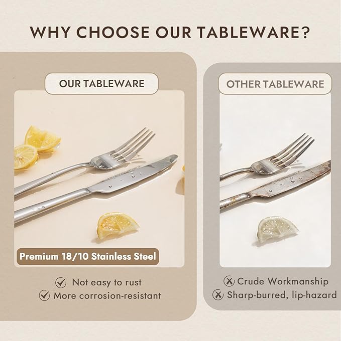 - Premium 18/10 Stainless Steel: Crafted from high-quality 18/10 stainless steel, this silverware set resists corrosion, rust, and stains, maintaining its integrity through frequent use. It withstands exposure to heat without warping or deteriorating—ideal for serving hot soups, grilled dishes, or roasted vegetables. Whether it's a busy Tuesday dinner or a weekend gathering, these pieces stay looking like new, meal after meal