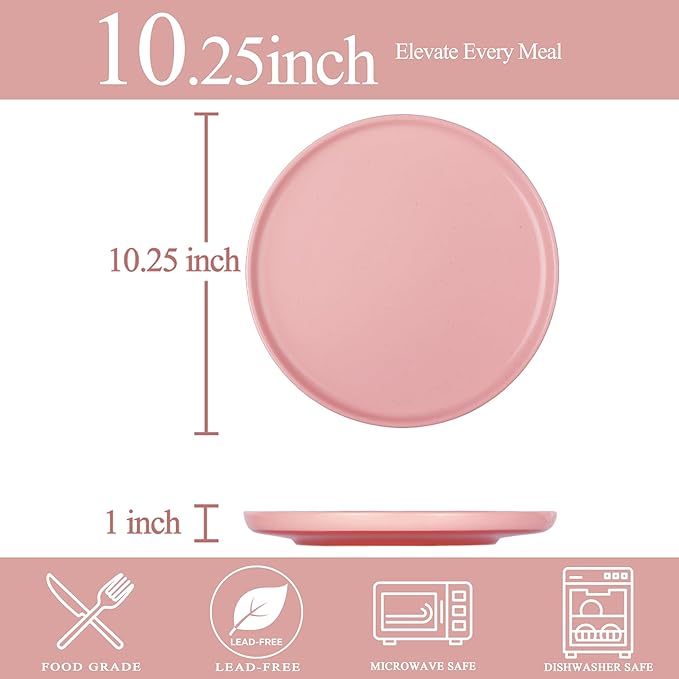 Stoneware Dinner Plates Set of 4, 10.25 Inch Plates for Steak, Pasta, Ceramic Plates Sets, Microwave Safe, Dishwasher Safe, Versatile for All Seasons, Pink