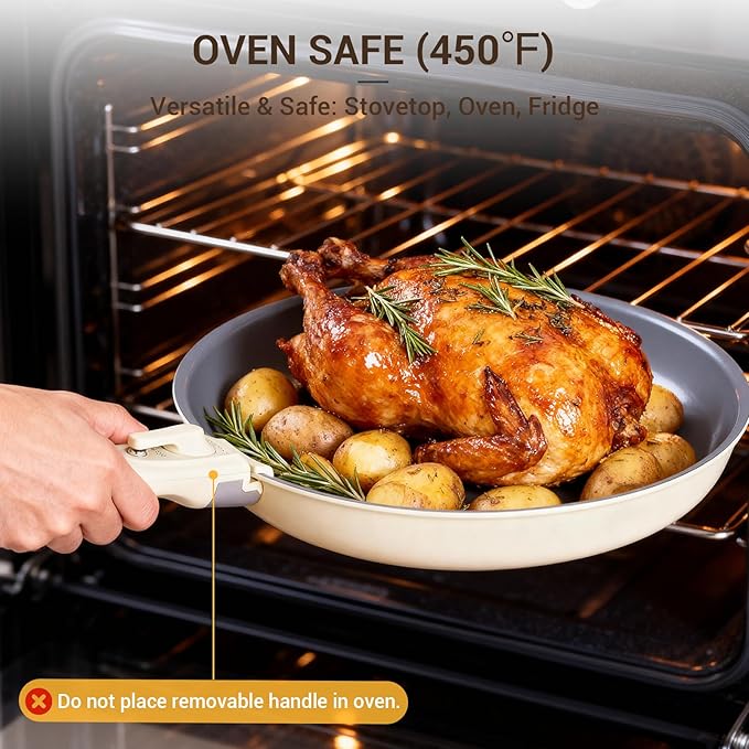 - Detachable Handle: This oven safe pots and pans set features a detachable handle with a secure locking mechanism and upgraded metal protection, ensuring stable and reliable use. It easily transitions between stovetops, ovens, grills, and refrigerators, making it ideal for compact spaces, RVs, and campers