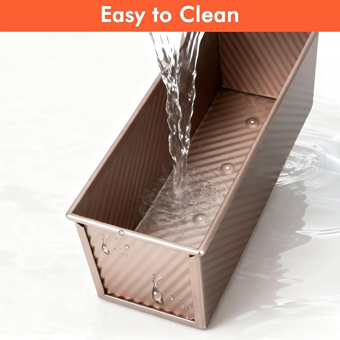 - Non-Stick Coating & Easy to Clean --- The pretty slick nonstick coating on loaf pan which is easy to clean, making the bread dough and baked bread can be removed from it easily. We suggest that spray the pan with some cooking spray before putting dough in it to get the nonstick coating working well. Moreover, be careful with the sharp inner curls and outer corners of the pans while using or cleaning them.