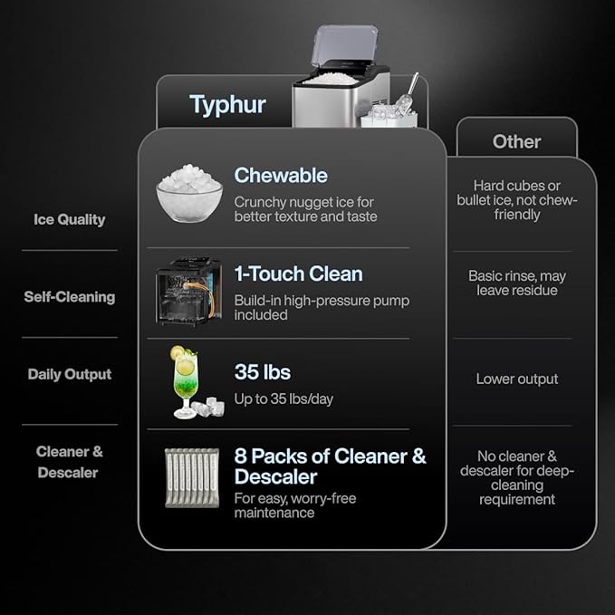 Typhur Fast Nugget Ice Maker Countertop with Self-Cleaning Pump, 35lbs/24H Crushed Pebble Ice Machine with Pellet Ice, 8 Packs Cleaner, Dual Ice Scoops for Home, Kitchen, Party, RV, Stainless Steel
