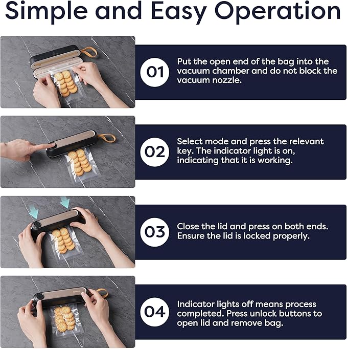- Easy to use: Portable vacuum sealer with one button start design great for kitchen green hand. Simply place the bag into the vacuum chamber, select mode and press the relevant key, then it will auto start and shut off.