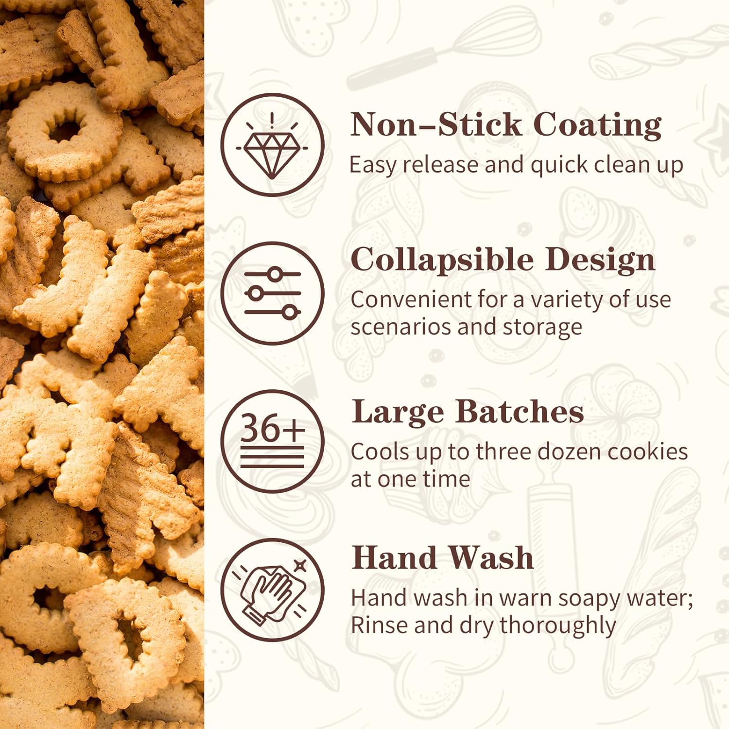 - 【Effortless Cleanup, Every Time】Say goodbye to scrubbing stuck-on crumbs or grease! Featuring a slick, food-release coating, grime and sugary residue simply wipe away with a damp cloth or quick rinse. No soaking, scraping, or battling stubborn stains. Imagine effortlessly cleaning after glazing sticky cinnamon rolls or messy BBQ ribs – this cookie cooling rack makes post-cooking cleanup a breeze. The non-toxic, non-stick surface also protects your delicate baked goods. Spend less time cleaning and more time enjoying your creations.