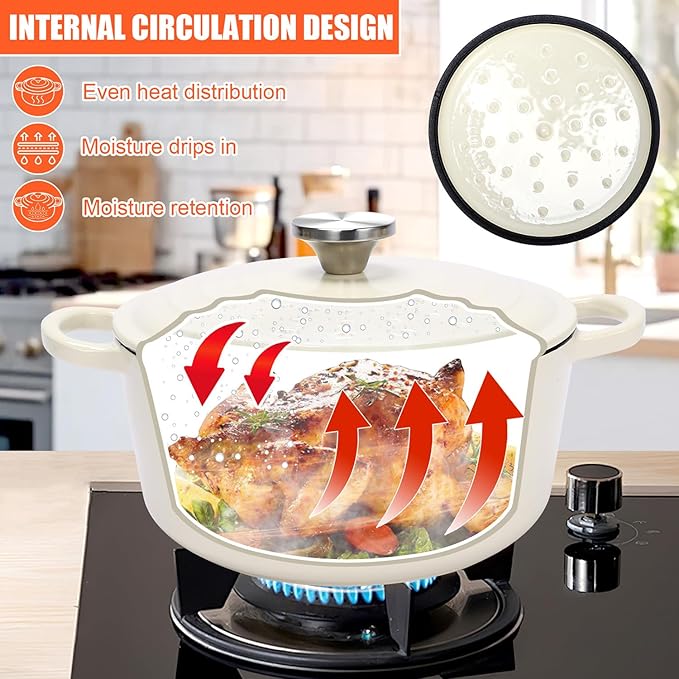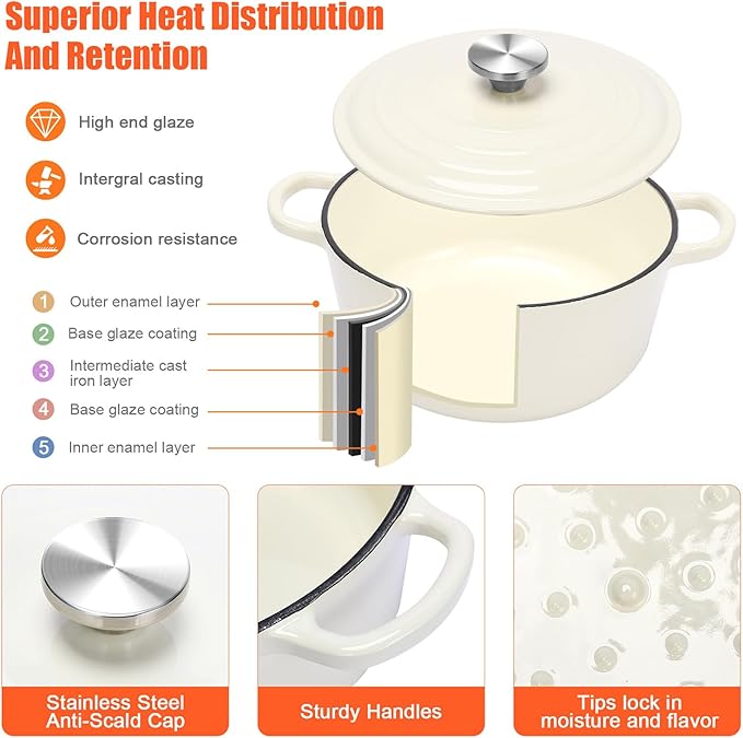 - 【Hard-Coat Enamel】Our cookware flaunts beautiful enameled interiors and exteriors. The hard-coat enamel, characteristic of enamel cast iron cookware set, resists scratches and chips, tough yet elegant. It supports all cooking styles – sauté, stew, roast, and broil. Plus, it's oven-safe up to 500℉, allowing you to seamlessly transition from stovetop to oven