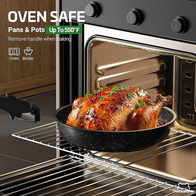 - Compatible with All Stovetops: OzawaBear cookware set works on induction, gas, electric, glass-top stoves, and ceramic stoves—plus oven-safe up to 550°F. Includes silicone lids (oven safe to 350°F) and freezer-friendly sealing lids that handle -100°F to 170°F.