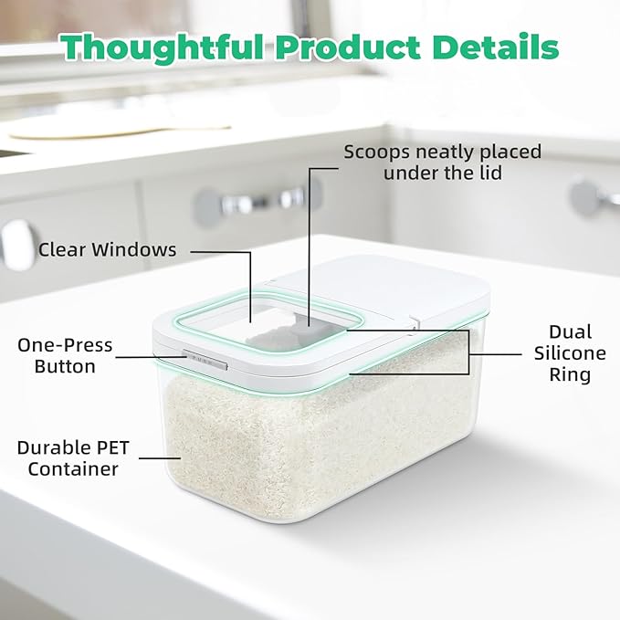 - SEAL TIGHTLY: Every rice storage container has been designed to seal in freshness and ensure your food always stay fresh. The sleek and see-through design offers a clear view of the contents and remind you the time to replenish