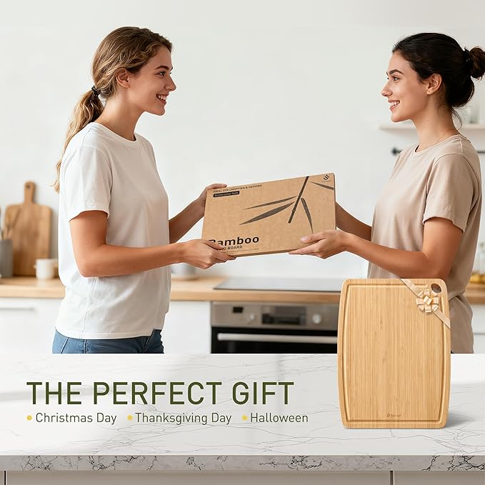 - BUILT TO ENDURE, DESIGNED TO LAST: Crafted from premium, high-density bamboo, this cutting board resists cracking, warping, and splintering even after years of everyday chopping. Its smooth, reinforced surface remains sturdy and elegant through heavy-duty kitchen use. Perfect for slicing, dicing, and serving with confidence β a board that truly stands the test of time.