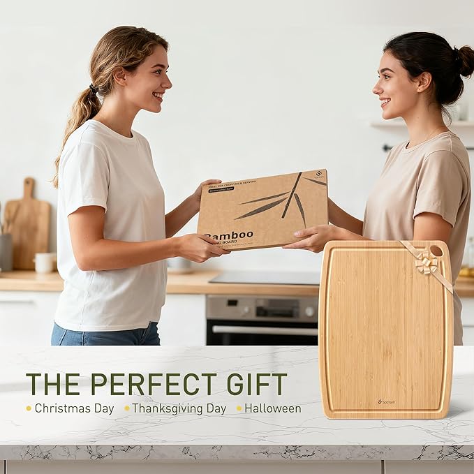 - BUILT TO ENDURE, DESIGNED TO LAST: Crafted from premium, high-density bamboo, this cutting board resists cracking, warping, and splintering even after years of everyday chopping. Its smooth, reinforced surface remains sturdy and elegant through heavy-duty kitchen use. Perfect for slicing, dicing, and serving with confidence β a board that truly stands the test of time.