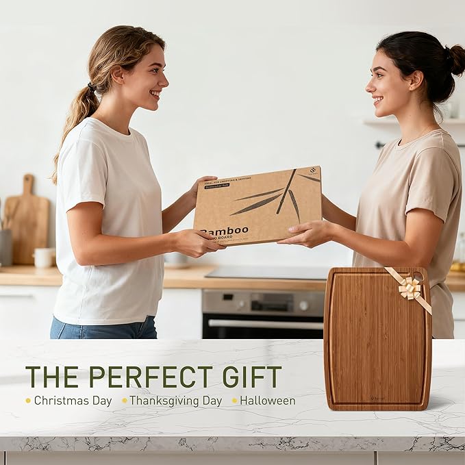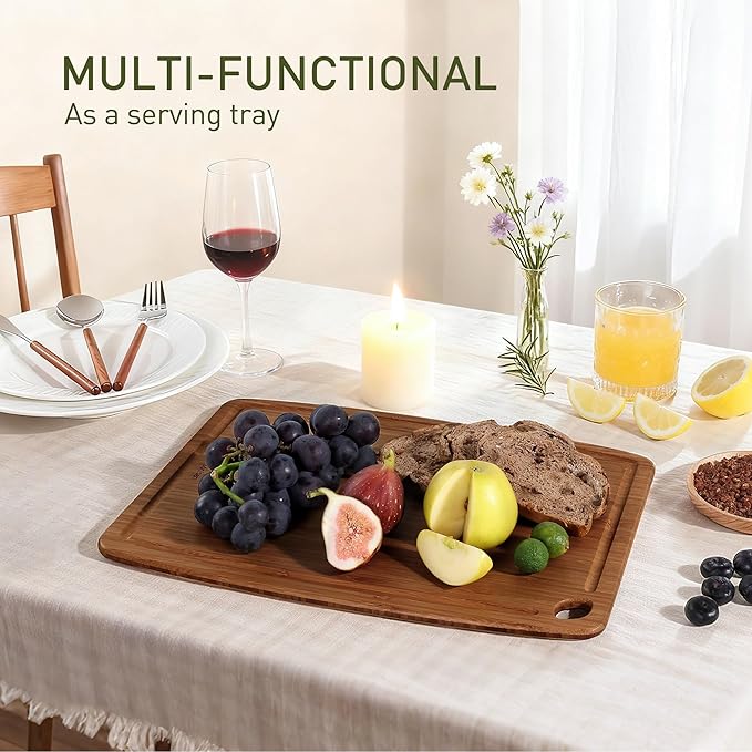 - BUILT TO ENDURE, DESIGNED TO LAST: Crafted from premium, high-density bamboo, this cutting board resists cracking, warping, and splintering even after years of everyday chopping. Its smooth, reinforced surface remains sturdy and elegant through heavy-duty kitchen use. Perfect for slicing, dicing, and serving with confidence β a board that truly stands the test of time.
