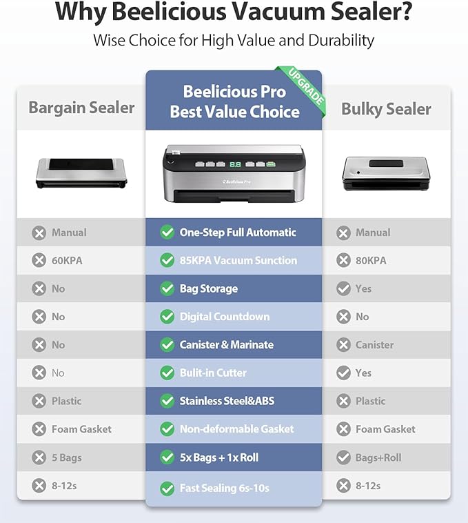 - 【85KPA Industry-Leading Suction】 Beelicious Vacuum Sealer boasts 120 watts of high power, achieving a rapid vacuum speed of 12 liters/minute. The pure copper core pump ensures corrosion resistance, heat resistance, and friction resistance, delivering an industry-leading suction power of up to 85KPA.