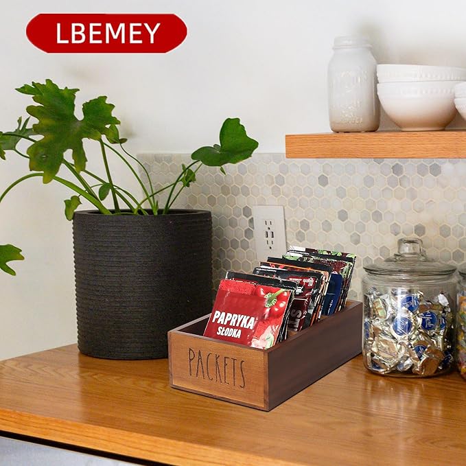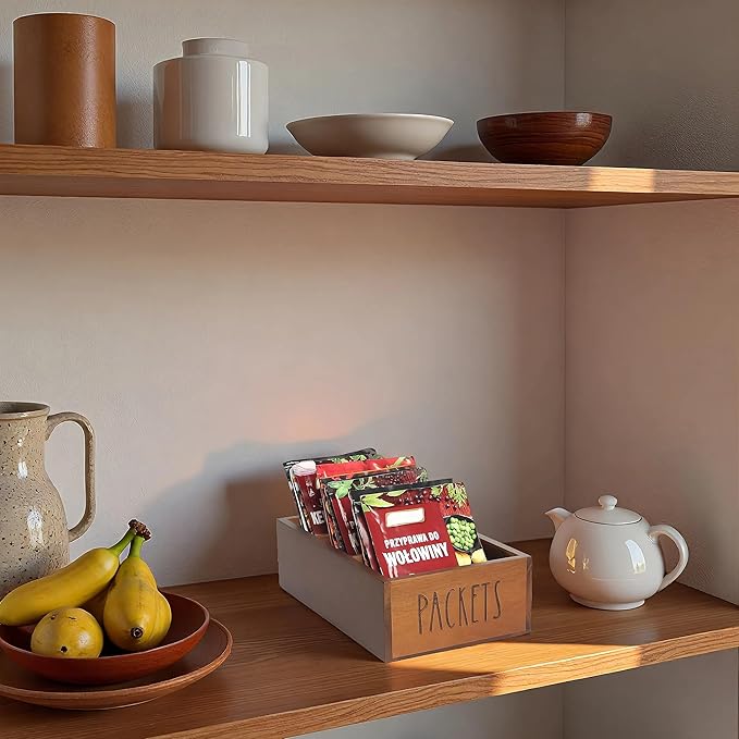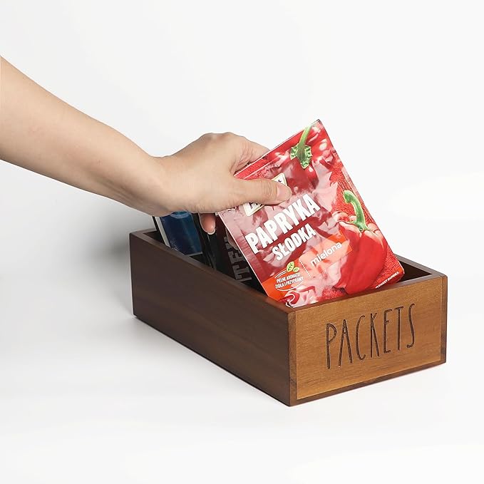 Packet Organizer, Acacia Wood Packet Storage Organizer with 3 Compartments,Farmhouse Kitchen Organization for Spice, Gravy, Taco, and Dressings Packets for Kitchen (Brown Label PACKETS)