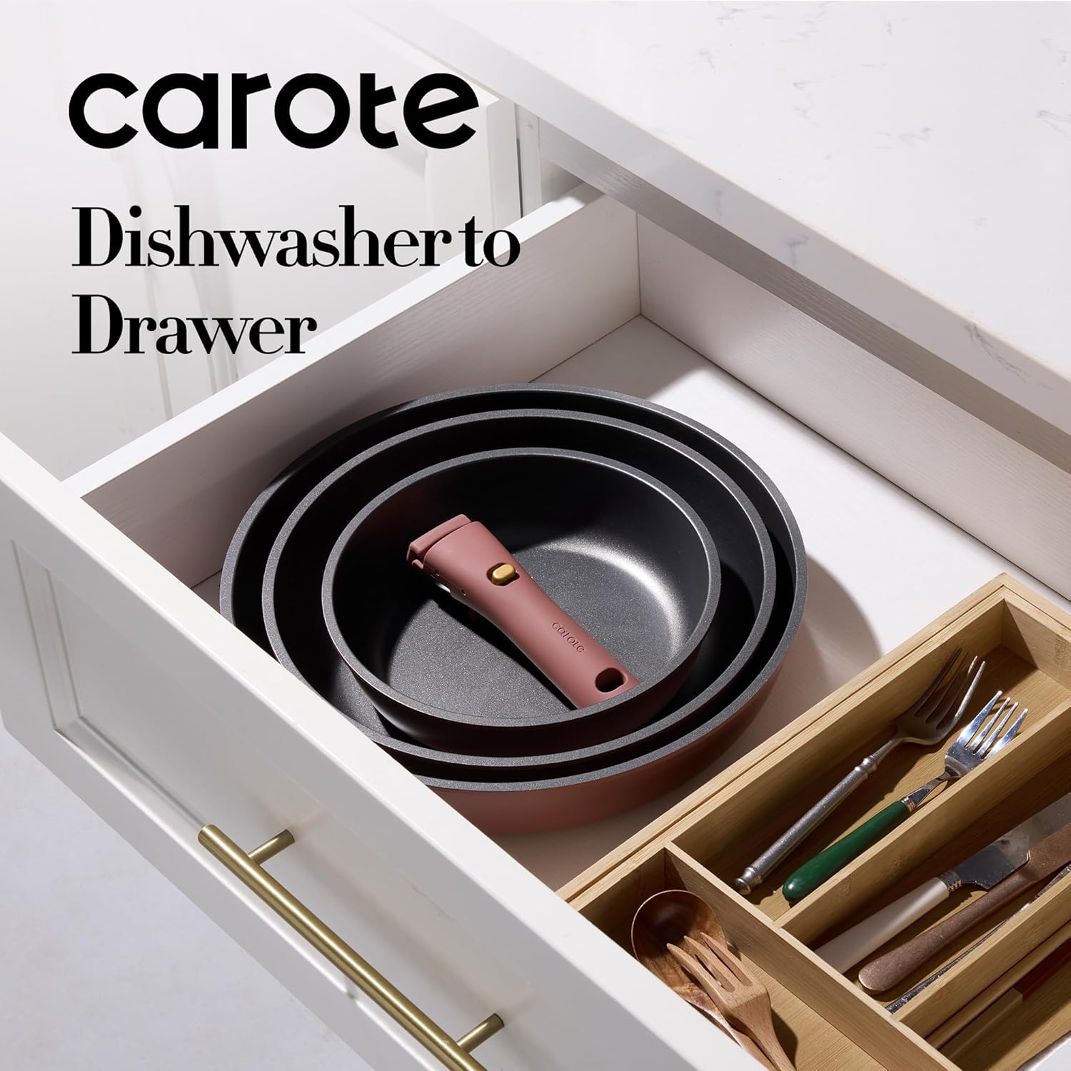 - Optimal storage and easy stacking with the handles off saves up to 70% more space of Carote detachable handle pots and pans set, keeping your kitchen neat and organized.