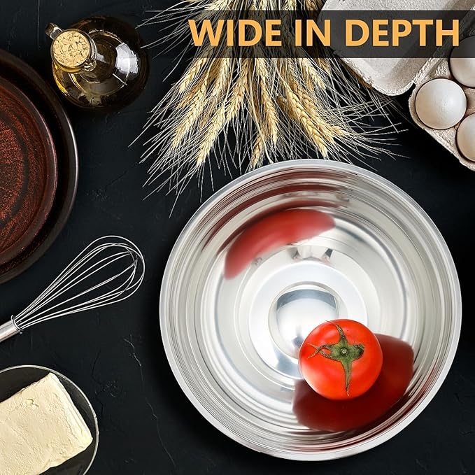 - 【Nesting Design】 5 stainless steel bowls can be stacked in layers to save kitchen storage space. Whether it is a drawer or cabinet, it can be easily accommodated, making your kitchen look more tidy and organized, as well as easy and quick to access