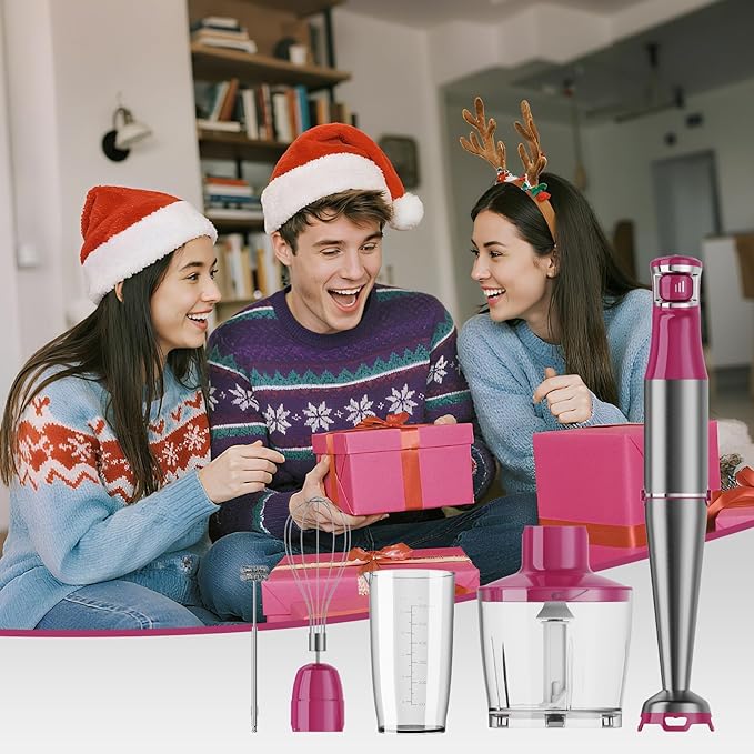 Immersion Blender Handheld Corded Hand Blenders Set 1100W, Trigger Variable Speed 5 in 1 Stick Emulsifier with Chopper, Whisk and Frother for Soup, Baby Food and Smoothies, Rose Red