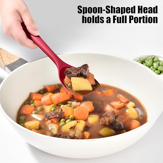 - [Why is the silicone spoon spatula so versatile?] Its spoon-like bowl and spatula-like edge make the spoonula ideal for a wide range of kitchen tasks: it excels in baking, where it can scrape mixing bowls, fold egg whites into cake batter; it’s useful for stovetop cooking, helping stir sauces, soups, and curries, sauté veggies, flip eggs, and mix pancake or waffle batter. The slight bowl shape helps scoop sauces from corners of pots and pans, minimizing waste and ensuring thorough mixing.