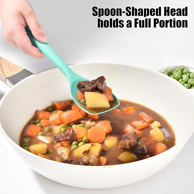 - [Why is the silicone spoon spatula so versatile?] Its spoon-like bowl and spatula-like edge make the spoonula ideal for a wide range of kitchen tasks: it excels in baking, where it can scrape mixing bowls, fold egg whites into cake batter; it’s useful for stovetop cooking, helping stir sauces, soups, and curries, sauté veggies, flip eggs, and mix pancake or waffle batter. The slight bowl shape helps scoop sauces from corners of pots and pans, minimizing waste and ensuring thorough mixing.