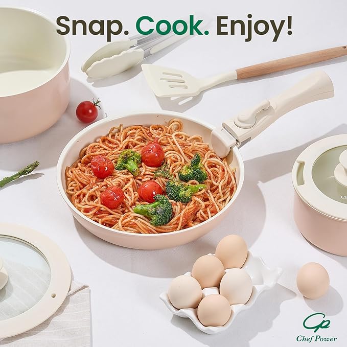 - Easy To Store - Chef Power removable cookware set makes kitchen storage simple, easy to stack and saves 70% space.