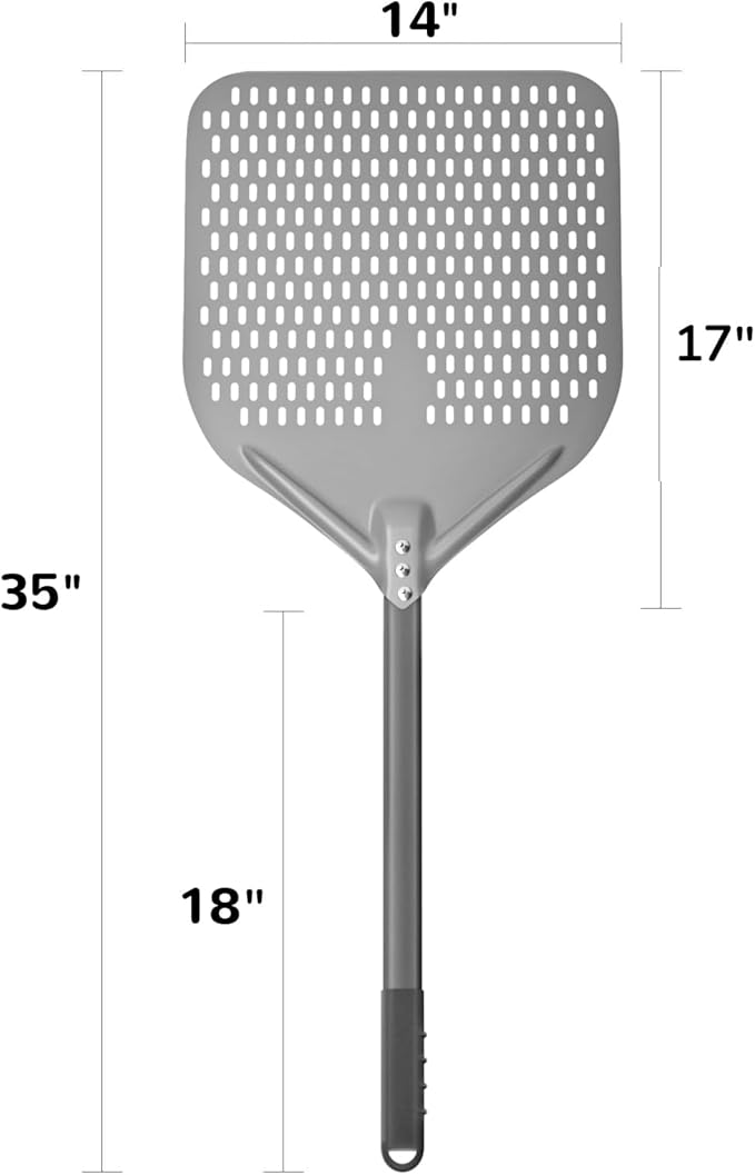 - 【RECTANGULAR PERFORATED HEAD】The 14" x 17" milled aluminum head boasts a beveled edge for easy handling, allowing pizzas to slide in smoothly. The perforated design of pizza spatula reduces the need for excessive cornmeal or flour, ensuring your pizza comes out crispier and more flavorful, with less sticking