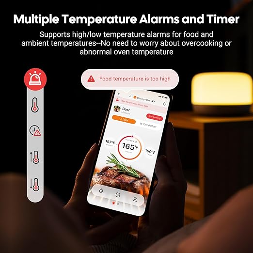 - High and Low Food/Oven Temp Alarms: The smart app offers 28 USDA-recommended meat menu options and features real-time high and low food temperature alarms, as well as high and low oven temperature alarms and other reminder functions, to help you avoid overcooking every time