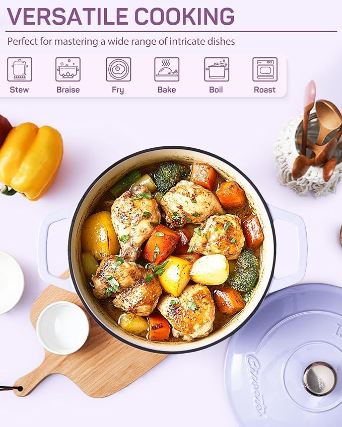 - Stylish & Functional Design: Combining practical functionality with elegant design, the cast iron dutch oven is a beautiful addition to any kitchen. Available in various colors and featuring an elegant shape, it enhances your cooking experience and adds a stylish touch to your kitchen decor