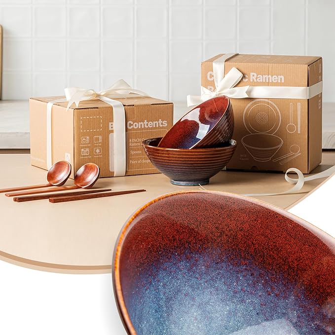 - Complete Dining Set & Ideal Gift: Each set includes 2 ceramic ramen bowls, 2 spoons, and 2 pairs of chopsticks, all made from high-quality materials. This beautifully packaged set makes a thoughtful gift for housewarmings, weddings, birthdays, holidays, or any special occasion. Share the joy of delicious meals with your loved ones.